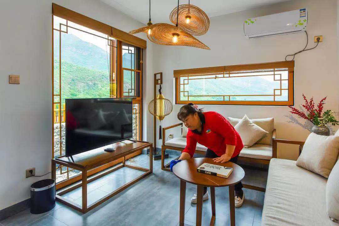 剛才提到的孫大姐,現(xiàn)在如愿地有了穩(wěn)定的工作——創(chuàng)藝鄉(xiāng)居精品民宿管家,經(jīng)過(guò)培訓(xùn),她已經(jīng)可以在5分鐘內(nèi)換好床單、被罩、枕芯所有床品,還會(huì)把毛巾疊出栩栩如生的小動(dòng)物。她說(shuō),以前總覺得自己低人一頭,現(xiàn)在有了穩(wěn)定工作送到咱家門口,有了份工作,收入不僅翻了倍,而且活的更有價(jià)值和尊嚴(yán)了。