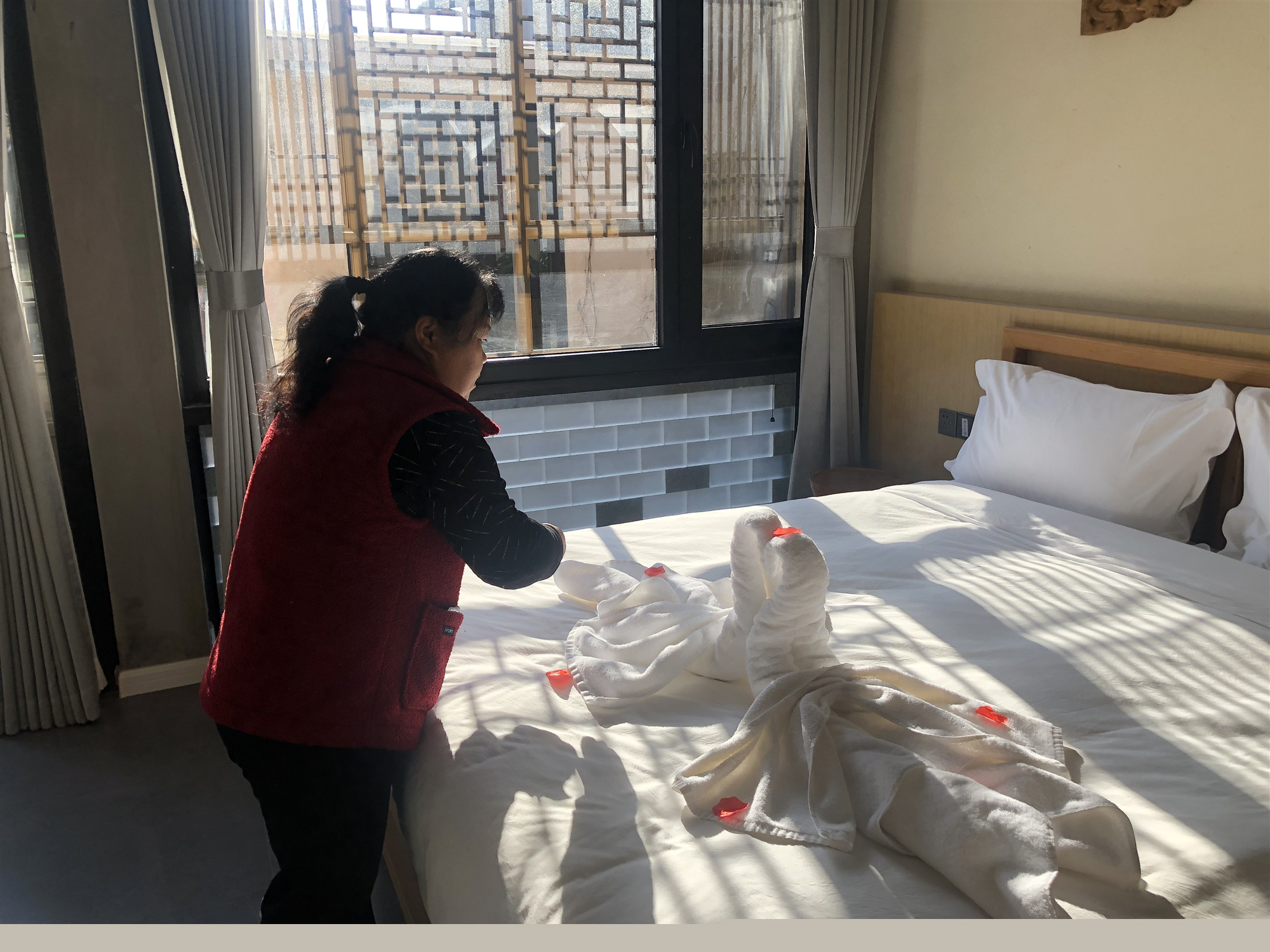 現(xiàn)在的孫榮興已經(jīng)是創(chuàng)藝鄉(xiāng)居精品民宿管家,經(jīng)過培訓(xùn),她已經(jīng)可以在5分鐘內(nèi)換好床單、被罩、枕芯所有床品,并將毛巾擺出天鵝的造型。