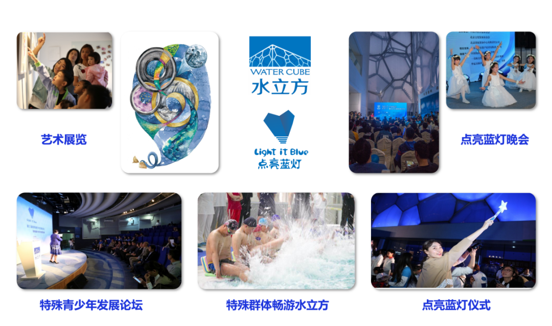 水立方自2011年起開(kāi)始致力于倡導(dǎo)對(duì)自閉癥譜系障礙群體的關(guān)愛(ài)活動(dòng)。十年來(lái),水立方通過(guò)每年在4月2日這一天“點(diǎn)亮藍(lán)燈”持續(xù)為自閉癥譜系障礙群體發(fā)聲,與專(zhuān)業(yè)機(jī)構(gòu)協(xié)作,通過(guò)發(fā)起特殊青少年發(fā)展論壇、開(kāi)放公益參觀游覽、舉辦特殊兒童藝術(shù)展覽、開(kāi)展對(duì)特殊群體的公益游泳培訓(xùn)等多種線下活動(dòng),用實(shí)際行動(dòng)表達(dá)對(duì)自閉癥譜系障礙群體的關(guān)愛(ài),并提供切實(shí)可行的幫助。
